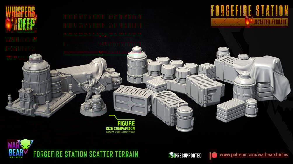 9x 35 mm sized, highly detailed Forgefire Station Scatter Terrain from the Whispers in the Deep collection.